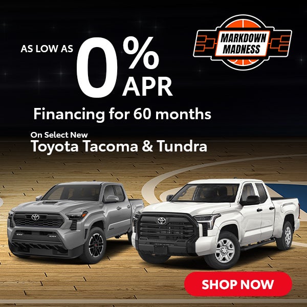 Qualified customers who finance a new Tacoma or new Tundra can receive as low as 0% APR for 60 months with 60 monthly payments of $16.67 for every $1,000 financed. Not all models qualify. Eligible models include 7532, 7146, 8261, 8361, 8372, 8375, 8421. Dealer doc fee is $85 and is not included. For only very well qualified customers. Max amount financed is $20,000 on Tacoma and $30,000 on Tundra. Amount financed, down payment amount, and credit worthiness may impact availability of offer. There is no cash back option. Dealer contribution may vary and could affect price. Individual dealer prices, other terms and offers may vary. Must take retail delivery from dealer's stock and terms subject to vehicle availability. Cannot be combined with TFS Lease Cash, Down Payment Assistance, Trade-in Assistance, Customer Cash, Lease, Lease Subvention Cash. See your participating Toyota dealer for details. Dealer sets final price. Expires 3-31-2026.